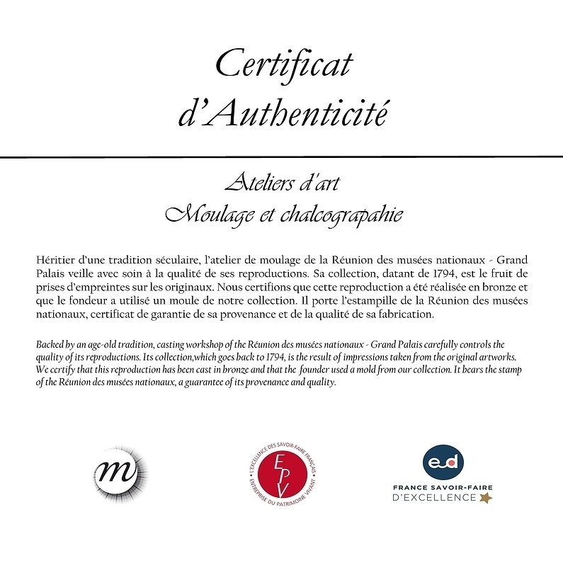 Hand-patinated bronze reproduction. Mould made from an imprint of the original work. Although modeled under the Consulate, the bust of Napoleon after the model of Chaudet was adopted as the official portrait of the Emperor until 1810. It existed in two sizes: the first-size models were few in number and reserved for leading characters, while the second-size ones were the usual complement to the second-order presents. This second-size copy was made in 1808.