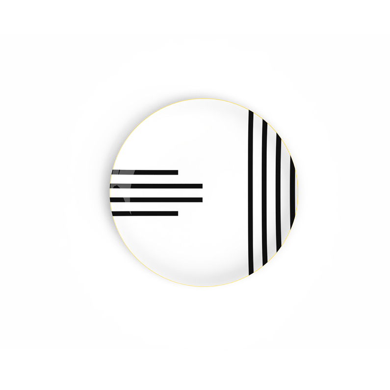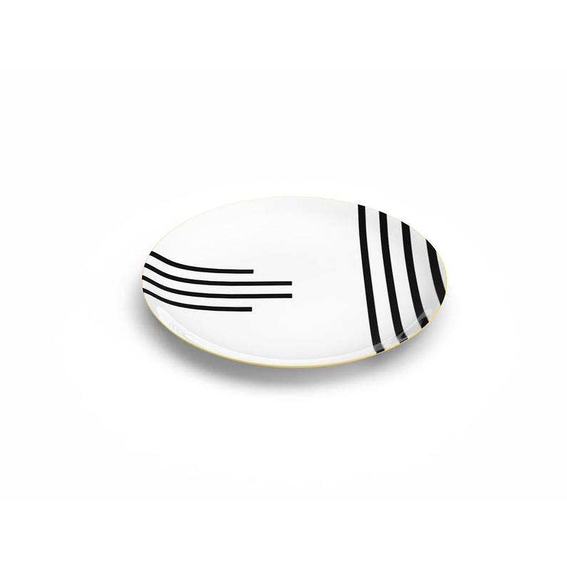 The Teatro dessert plate in porcelain features a striking black and white graphic design, enhanced with gold accents. With a diameter of 21 cm, it is perfect for serving desserts or starters. Made in France, it is dishwasher-safe (recommended), but not suitable for use in the microwave or oven.