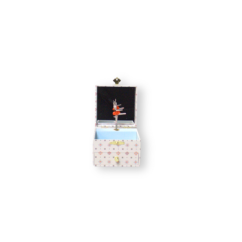 Découvrez cette Boîte à musique Blanc et Rose - Danse Rêvée. À l'ouverture, une ballerine se met à tourner sur une douce mélodie. Comprend un tiroir et un intérieur bleu doux, idéal pour ranger bijoux ou petits trésors.