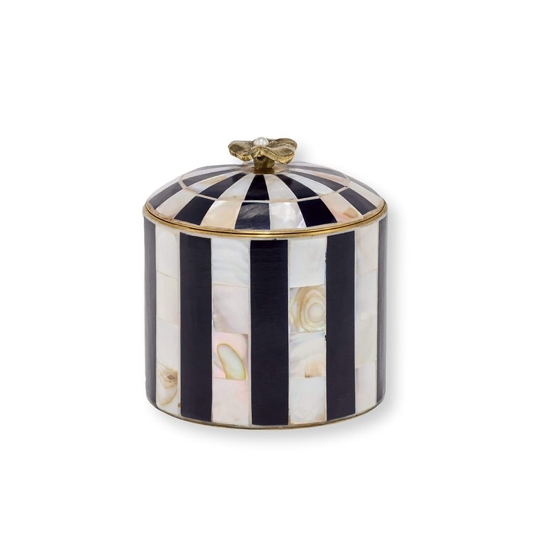 Découvrez notre Boîte de Cirque Zoey Grand Marin. Apportez charme et fonctionnalité à votre intérieur avec la Boîte Zoey Cirque. Cette pièce artisanale aux rayures bleu marine et blanc en nacre et résine, ornée d'une délicate fleur en laiton sur le couvercle, mesure 10,5 × 10 × 10 cm. Parfaite pour organiser vos objets du quotidien ou comme pièce décorative centrale, elle allie praticité et élégance.