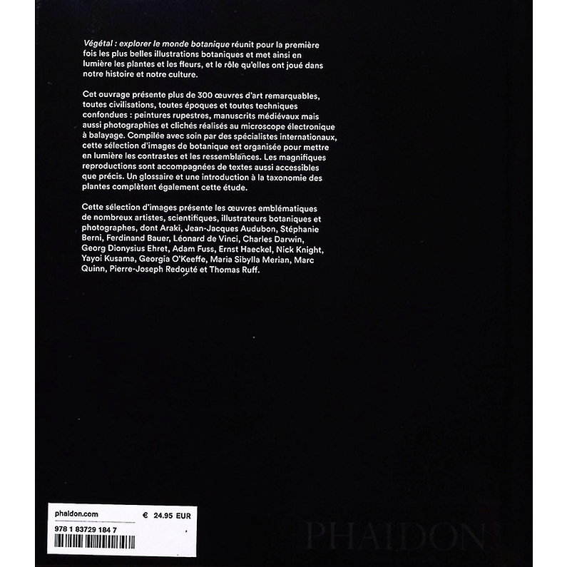 Végétal : explorer le monde botanique réunit pour la première fois les plus belles illustrations botaniques et met ainsi en lumière les plantes et les fleurs, et le rôle qu'elles ont joué dans notre histoire et notre culture. Cet ouvrage présente plus de 300 œuvres d'art remarquables, toutes civilisations, toutes époques et toutes techniques confondues : peintures rupestres, manuscrits médiévaux mais aussi photographies et clichés réalisés au microscope électronique à balayage. Compilée avec soin par des spécialistes internationaux, cette sélection d'images de botanique est organisée pour mettre en lumière les contrastes et les ressemblances. Les magnifiques reproductions sont accompagnées de textes aussi accessibles que précis. Un glossaire et une introduction à la taxonomie des plantes complètent également cette étude. Cette sélection d'images présente les œuvres emblématiques de nombreux artistes, scientifiques, illustrateurs botaniques et photographes, dont Araki, Jean-Jacques Audubon, Stéphanie Berni, Ferdinand Bauer, Léonard de Vinci, Charles Darwin, Georg Dionysius Ehret, Adam Fuss, Ernst Haeckel, Nick Knight, Yayoi Kusama, Georgia O'Keeffe, Maria Sibylla Merian, Marc Quinn, Pierre-Joseph Redouté et Thomas Ruff.